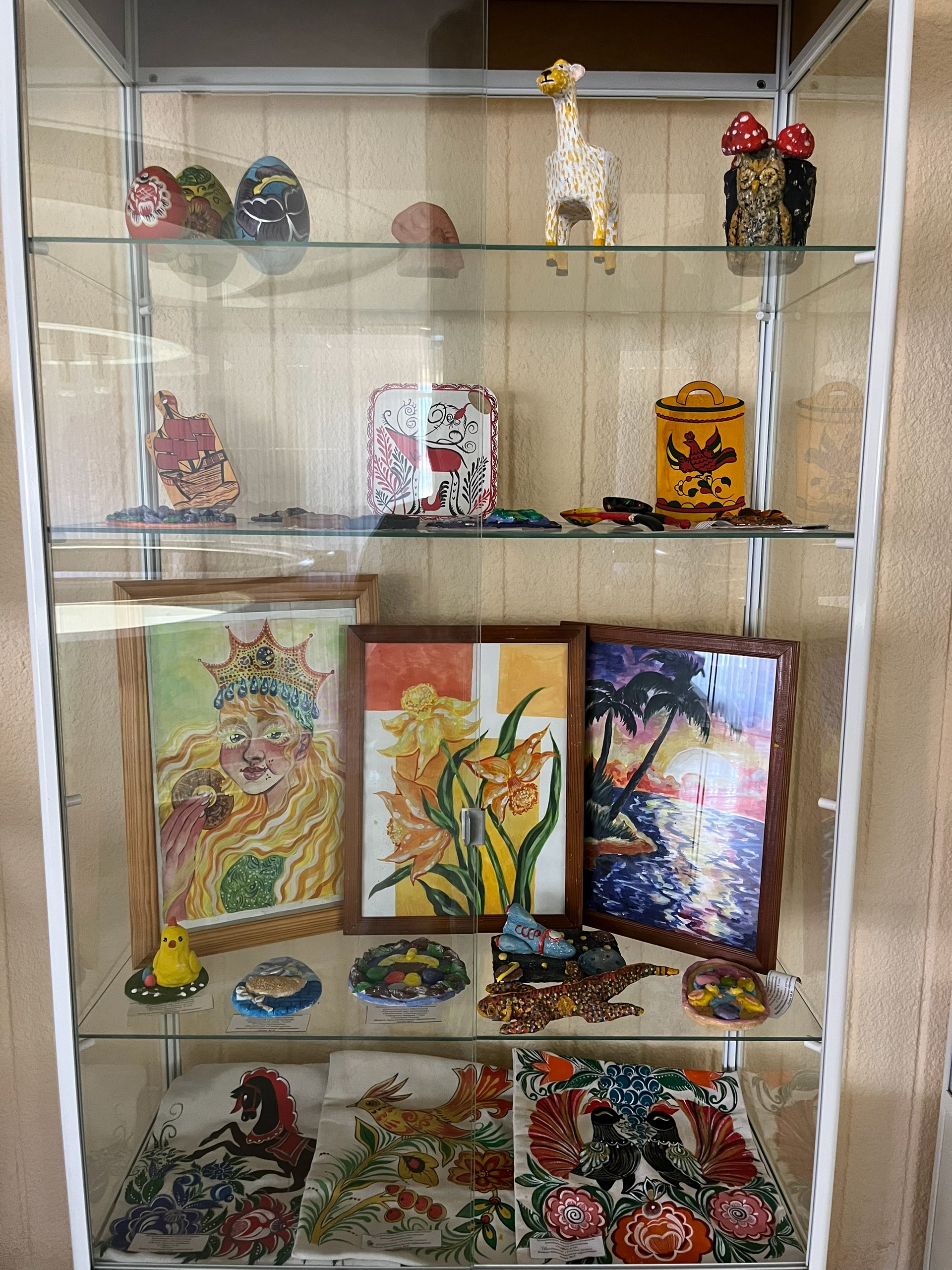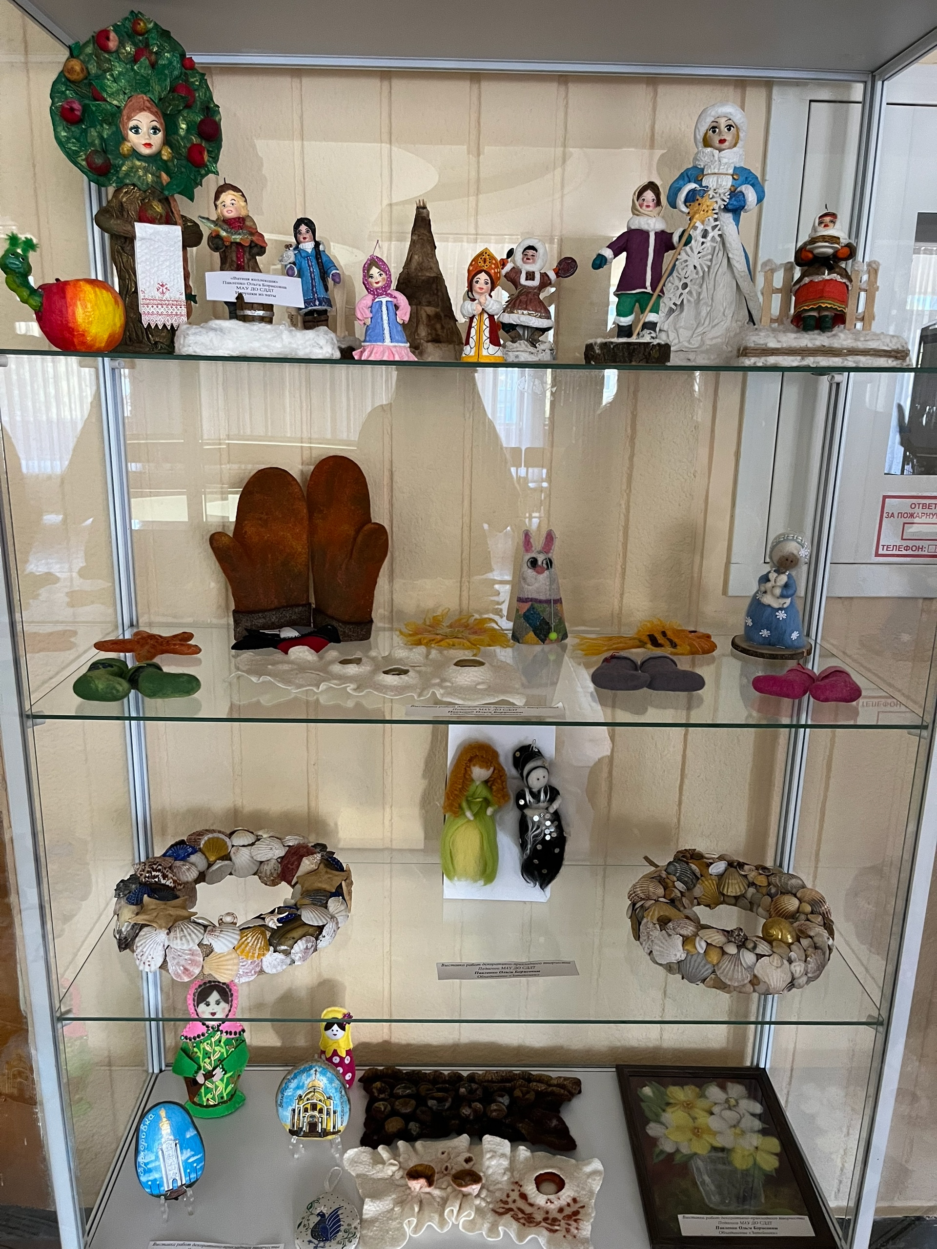 Здесь вы сможете увидеть удивительные изделия декоративно-прикладного и художественного творчества, созданные руками талантливых педагогов. Экспозиция включает в себя работы, выполненные в техниках сухого и мокрого валяния, вышивки бисером, лепки из соленого теста, росписи, холодного батика, скрапбукинга, а также авторские игрушки из ваты и многое другое.